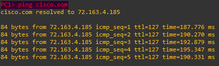 - 외부 연결 확인 : PING PC1 -> cisco.com