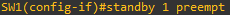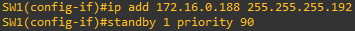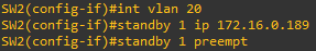HSRP설정을 위해 VLAN20에도 IP주소 할당하고, standby 상태로 만들기 위해 priority 90으로 설정.