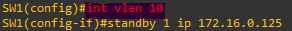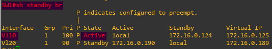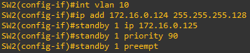 HSRP설정을 위해 VLAN10에도 IP주소 할당하고, standby 상태로 만들기 위해 priority 90으로 설정.