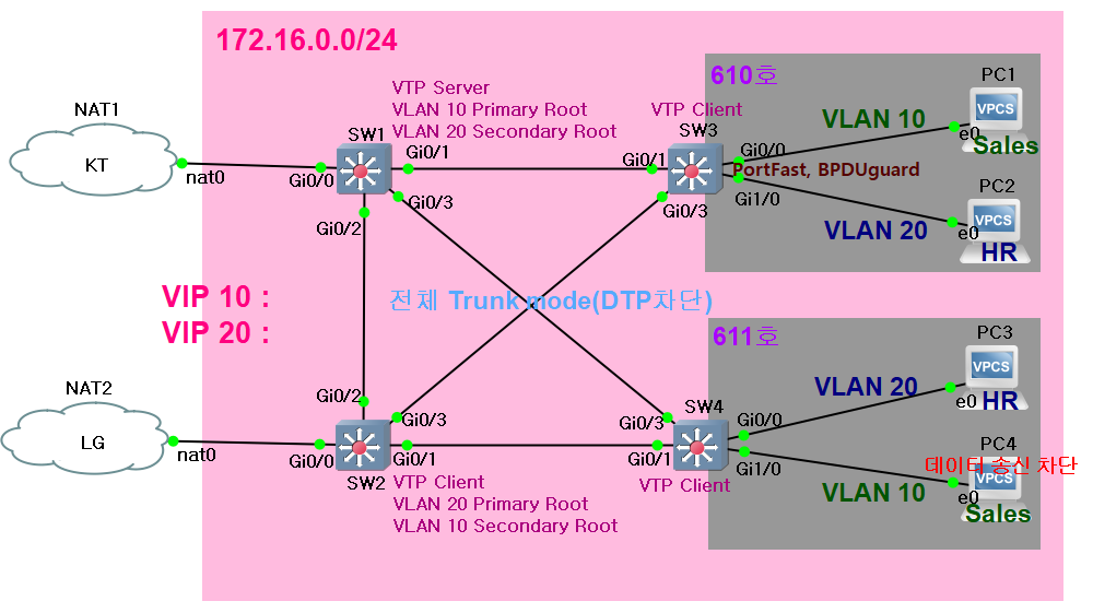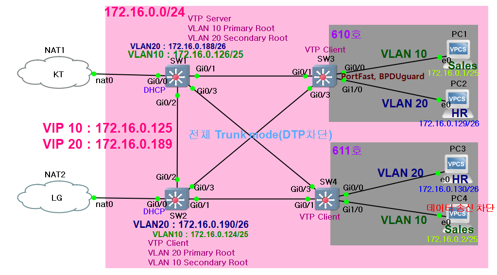 - 3계층 설정 : 서브넷팅, SVI, NAT 등 설정