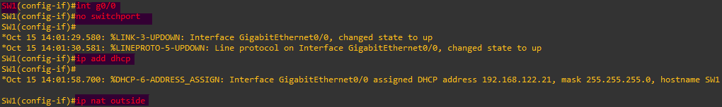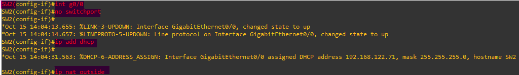 외부로 나가는 방향의 포트를 라우티드 포트로 바꿔주고 DHCP로 IP주소를 받아온 후 NAT 설정