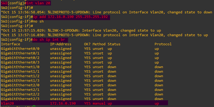 SW2-VLAN20 : 172.16.0.190 -> gateway로 사용