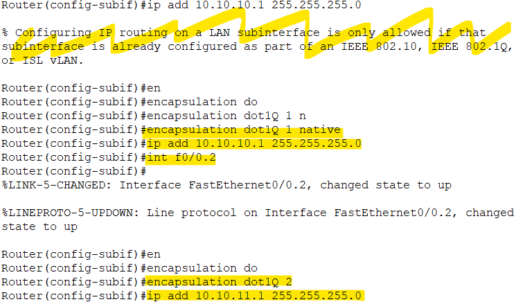 신나서 바로 IP주소 입력해주니까 뭐라뭐라 하면서 뜨는데 안된다는 뜻임. encapsulation dot1Q 1(요건 연결될 vlan 번호) 해주고 다시 IP주소 넣어주니까 잘 들어간다. 이 때 native를 해준 것은 VLAN 1을 기본 VLAN으로 쓰겠다(태그 안 붙이고 갈건데 그러면 VLAN 1이라고 생각해라)는 건데, 또한 이 연결에서 필수 요소는 아니다. 어차피 각각 연결해줄 것이기 때문에.