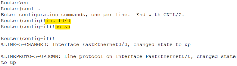 먼저 서브인터페이스로 나눠서 사용할 f0/0 인터페이스에 들어가 no shut으로 켜준다. 이렇게 켜주지 않고 개별 서브 인터페이스에서 켜는 것은 소용 없다.