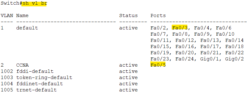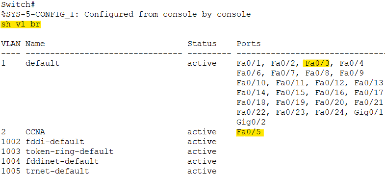 VLAN 1은 default로 모든 포트에 할당되어 있기 때문에 따로 내려줄 명령이 없다. VLAN 2만 f0/5에 할당해주었고, 잘 된 것까지 확인 완료.