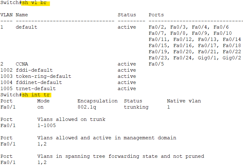 f0/1은 trunk로, f0/3은 VLAN 1로, f0/5는 VLAN 2로 잘 연결되었다. 실제로 show vlan brief로 보면 f0/1이 사라지고 없다.