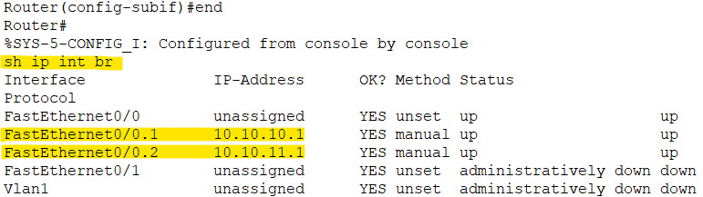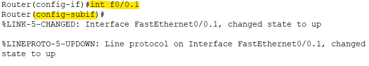 이 상태에서 "."으로 나눈 서브인터페이스에 들어가면 자동으로 up 된다. f0/0에서 켜주지 않았으면 이 과정에서 서브인터페이스가 켜지지 않고 조용하다. 먼저 f0/0에서 no sh 해주지 않았더라도 서브인터페이스 설정한 후에 no sh 해주면 동시에 다다닥 up 되었다고 뜬다.