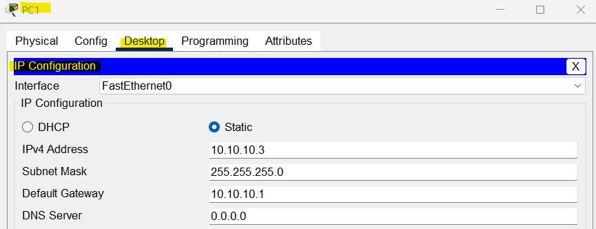 이제 PC만 설정해주면 된다. Desktop - IP Configuration 에 들어가서 IP주소, Subnet Mask, Default Gateway만 입력해주자. 게이트웨이는 아까 vlan 번호 지정해준 그 서브 인터페이스의 IP주소를 맞춰서 넣어주면 된다.